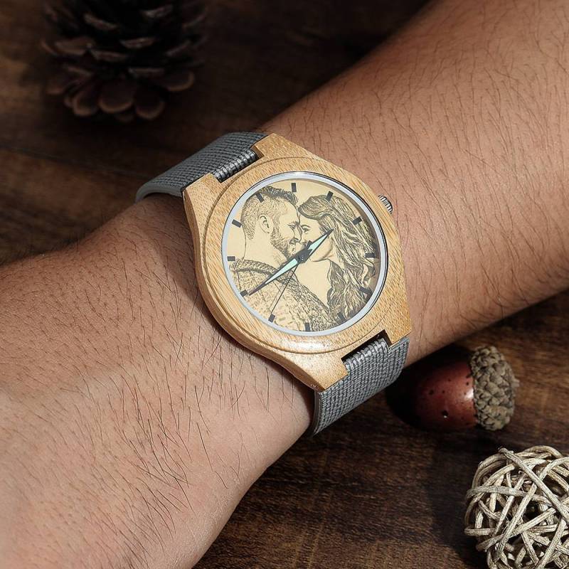 Women's Engraved Bamboo Photo Watch Grey Leather Strap 40mm
