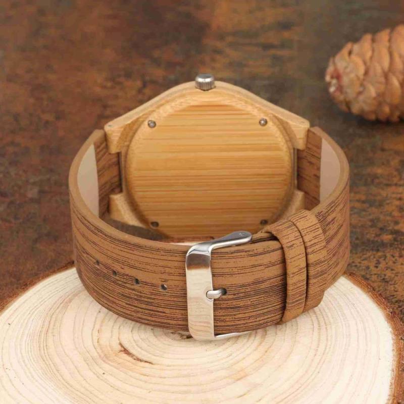 Men's Engraved Bamboo Photo Watch Wooden Leather Strap 45mm